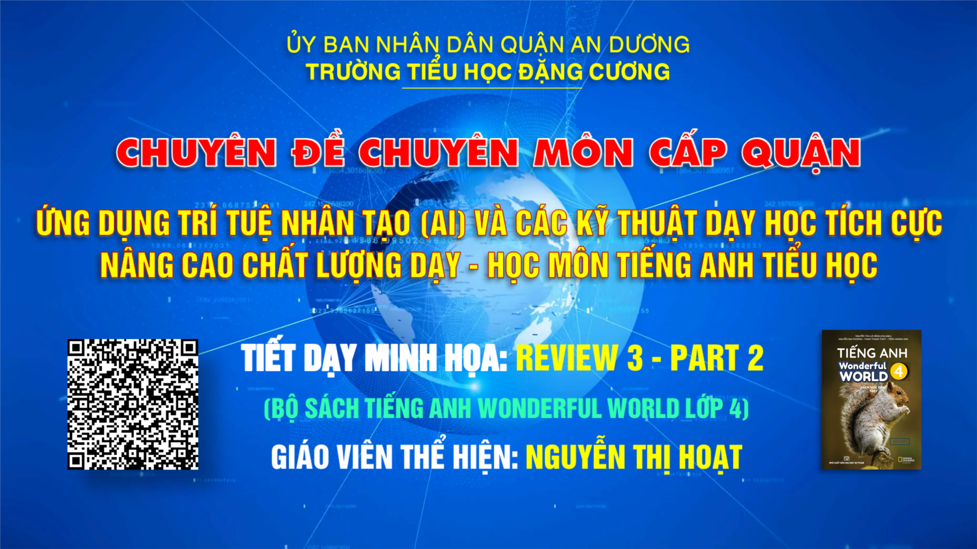 Tại chuyên đề, đồng chí Nguyễn Thị Hoạt – giáo viên Trường Tiểu học Đặng Cương – đã thực hiện tiết dạy minh họa với bài học “Review 3 - Part 2” thuộc bộ sách Tiếng Anh Wonderful World lớp 4. Tiết học được thiết kế công phu, kết hợp giữa công nghệ hiện đại và các phương pháp giảng dạy tích cực, mang đến một trải nghiệm học tập sáng tạo và hứng khởi cho học sinh.