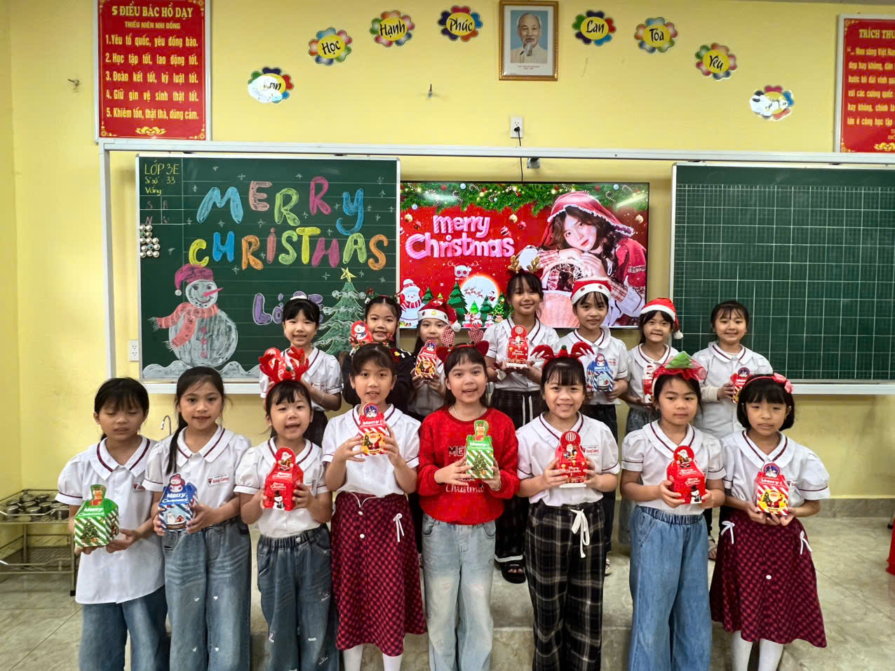 🎄 Không gian lớp học khối 3 được trang trí rực rỡ với cây thông Noel, ông già Noel, những bông tuyết trắng và các món quà xinh xắn do chính tay các em làm. Trong buổi lễ, các em học sinh hào hứng tham gia nhiều hoạt động sôi nổi như hát các bài hát Giáng sinh, giao lưu văn nghệ, kể chuyện về Giáng sinh và cùng nhau chia sẻ những lời chúc tốt đẹp.