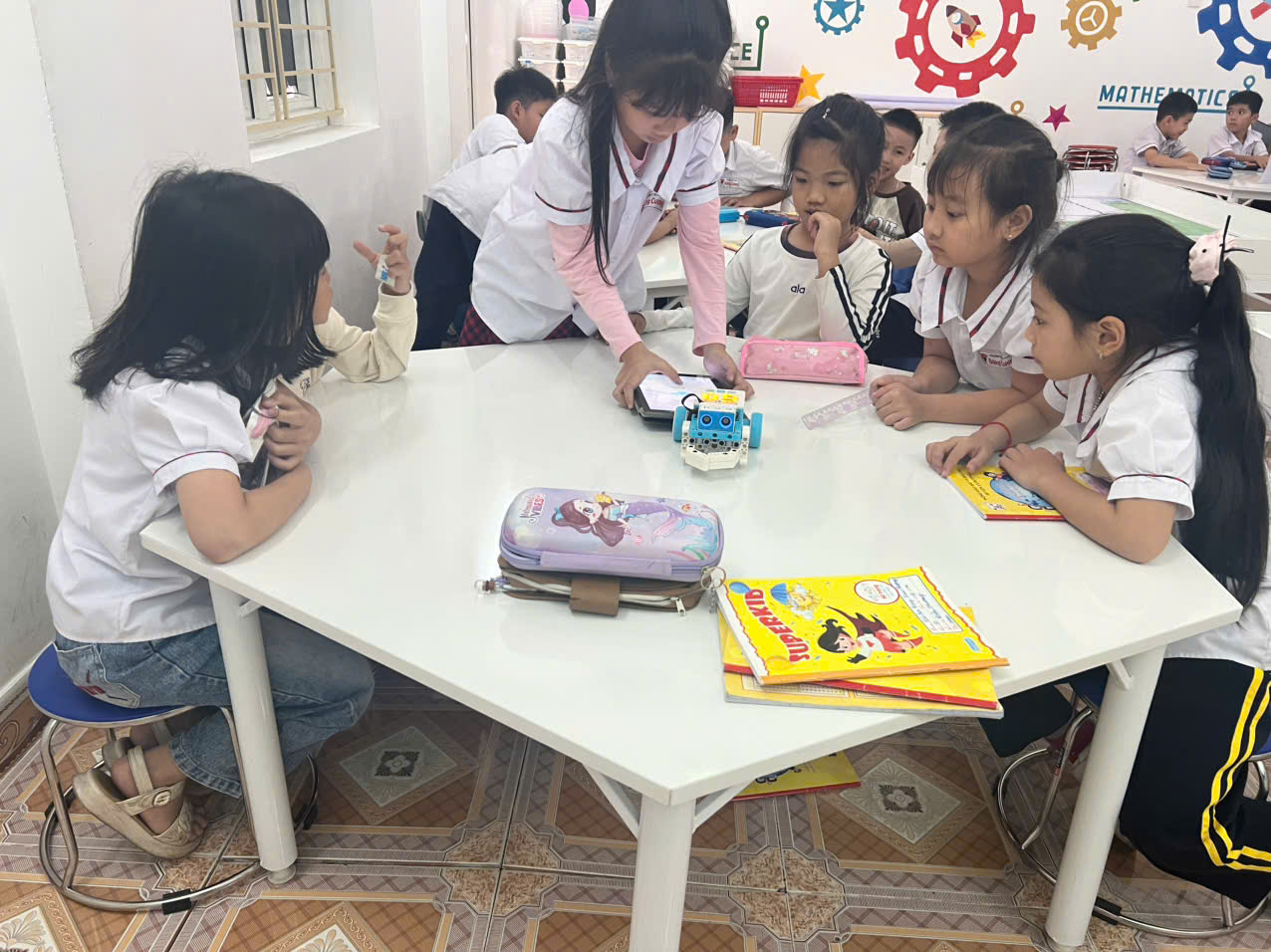 Không khí lớp học diễn ra sôi nổi, vui tươi nhưng cũng đầy tập trung và sáng tạo. Nhiều mô hình robot hoạt động hiệu quả đã thể hiện sự khéo léo, linh hoạt và khả năng tư duy của các em học sinh. Qua hoạt động STEM Robotics, học sinh không chỉ tiếp thu kiến thức khoa học công nghệ một cách tự nhiên, dễ hiểu mà còn rèn luyện các năng lực quan trọng như hợp tác, giải quyết vấn đề, tư duy thiết kế và kiên trì trong học tập.