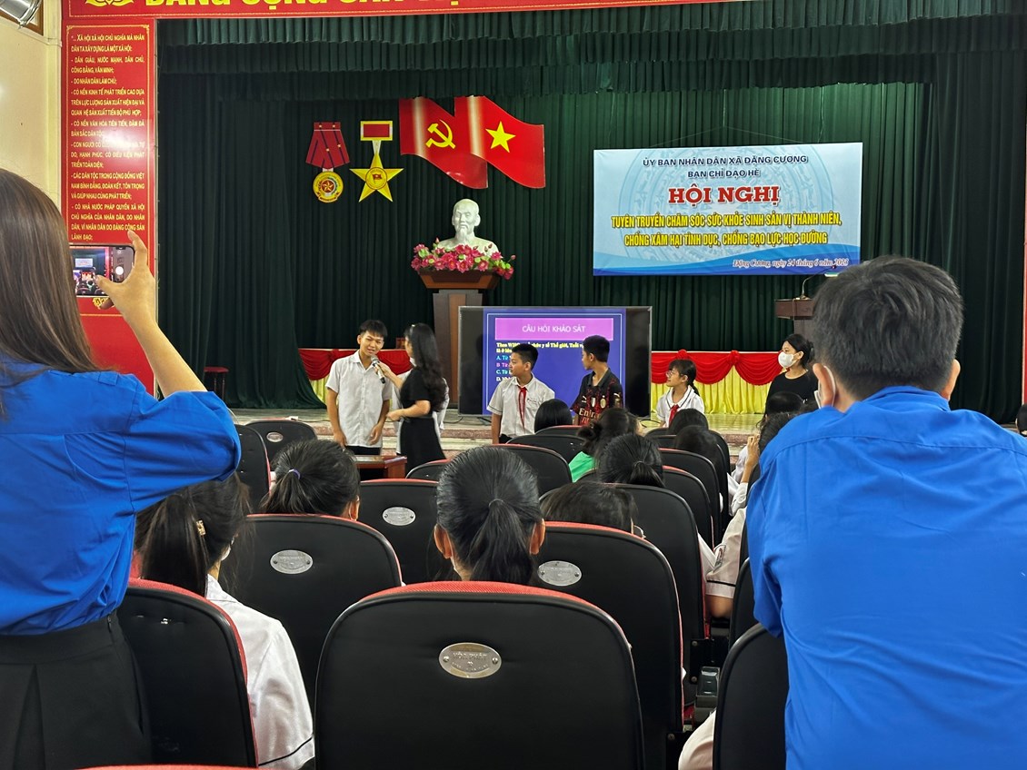 Buổi tuyên truyền đã nhận được sự quan tâm của các ban ngành Đoàn thể xã, Ban giám hiệu các nhà trường, sự hưởng ứng nhiệt tình của đông đảo Đoàn thanh niên, giáo viên và các em học sinh trường tiểu học và THCS Đặng Cương. Đây là một hoạt động thường niên của Đoàn thanh niên phối hợp với các trường học trên địa bàn xã nhằm cung cấp kiến thức, kỹ năng chăm sóc sức khỏe sinh sản cho trẻ vị thành niên và các biện pháp phòng, chống xâm hại tình dục trẻ em, chống bạo lực học đường, góp phần nâng cao chất lượng dân số xã và bảo vệ thế hệ tương lai của đất nước.