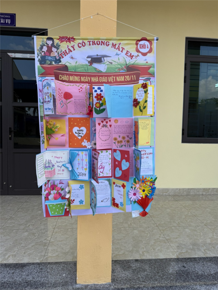 Góc làm thiệp thủ công không kém phần sôi nổi. Từ những đôi bàn tay nhỏ bé nhưng khéo léo, các em đã tạo nên những tấm thiệp đầy sáng tạo. Mỗi tấm thiệp là một lời chúc, một thông điệp yêu thương mà học trò gửi đến thầy cô. Những dòng chữ nắn nót, những câu chúc giản dị nhưng chân thành đã chạm đến trái tim người nhận, làm ấm lòng các thầy cô trong ngày đặc biệt này.