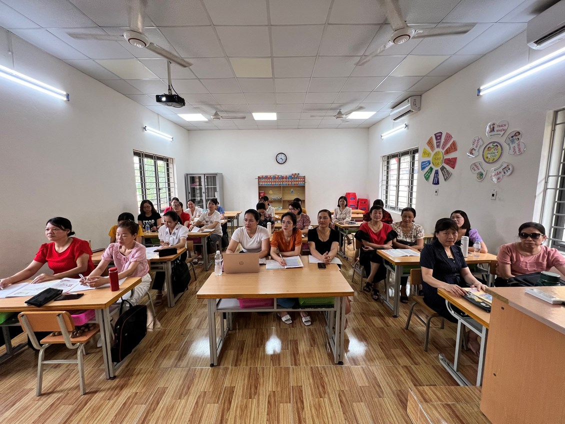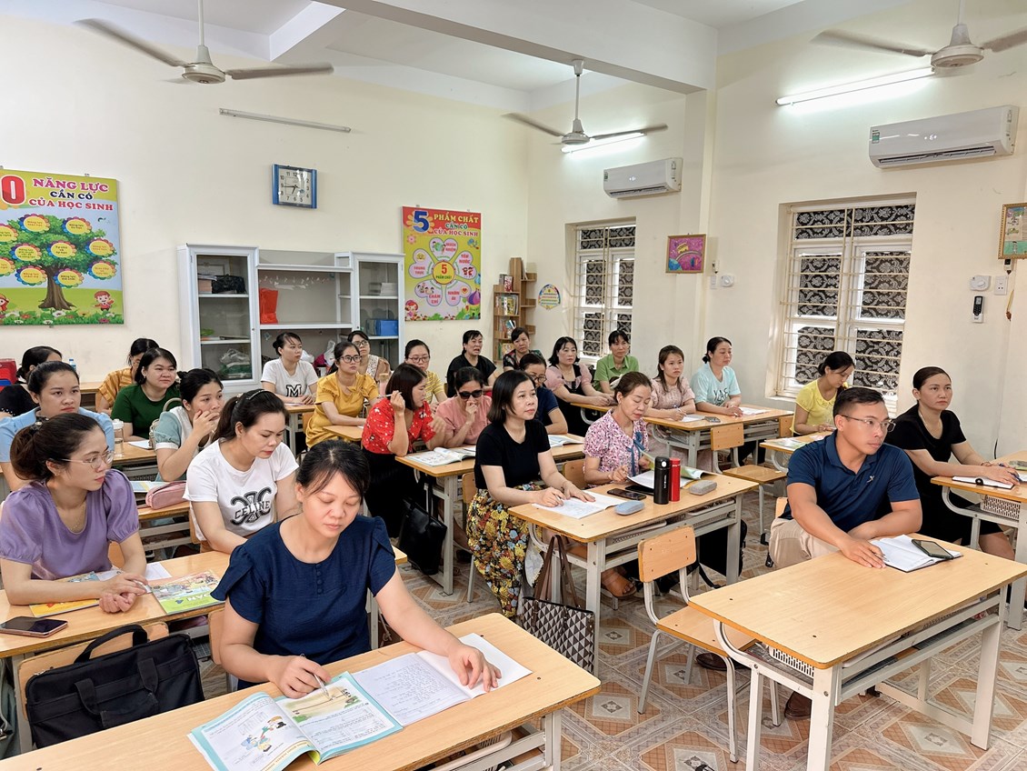 Thực hiện kế hoạch tập huấn sách giáo khoa lớp 4 theo chương GDPT 2018, từ ngày 24-28/7/2023 CBGV nhà trường đã tham gia tập huấn bộ sách "Kết nối tri thức với cuộc sống". Trong quá trình tập huấn giáo viên đã đưa ra những băn khoăn, thắc mắc từ thực tế về nội dung, chương trình, quy trình dạy học của bộ sách mới .......và đã được đội ngũ tác giả, chủ biên giải đáp, tư vấn; Giúp các giáo viên tiếp cận với nội dung chương trình và phương pháp dạy học theo định hướng phát triển năng lực phẩm chất học sinh.