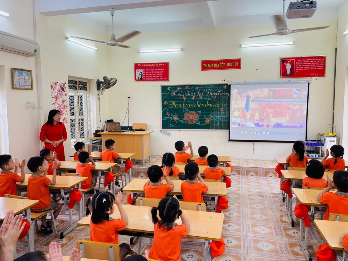 Trong buổi trải nghiệm các con được tham quan lớp học của các anh chị lớp 1. Bước vào cửa lớp các bạn học sinh 5 tuổi được cô giáo hát, đọc thơ chào đón làm cho trẻ cảm thấy gần gũi, không có sự xa lạ ở môi trường mới. Khi được ngồi vào bàn học, được tham gia các hoạt động, trò chuyện với các cô giáo chủ nhiệm lớp một, làm quen với môi trường học tập ở trường tiểu học như: sách, vở, tranh ảnh, đồ dùng, các sản phẩm của các anh chị lớp 1 đã sáng tạo ra... các con học sinh 5 tuổi rất tò mò, thích thú và chú ý lắng nghe.